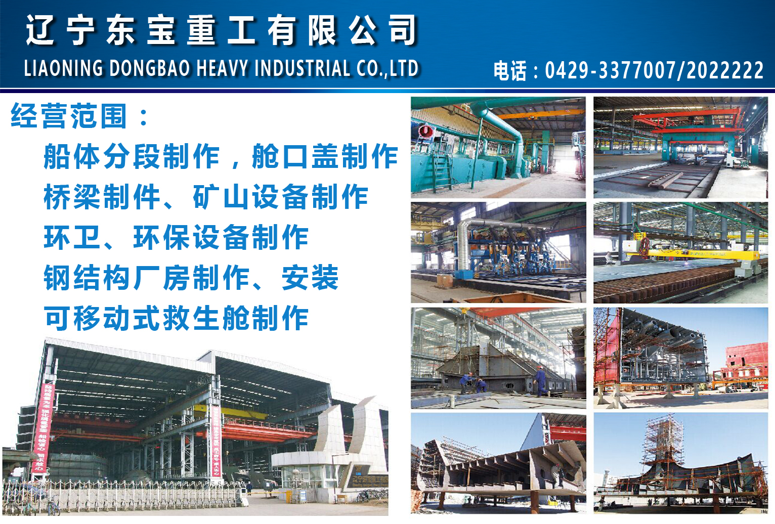 Liaoning Dongbao Heavy Industry Co., Ltd. is located in Huludao Marine Engineering Supporting Park, covering an area of 80,000 square meters and a total construction area of 56,000 square meters. 公司主要經(jīng)營(yíng)范圍:船體分段制作,艙口蓋制作, 橋梁制件、鋼結(jié)構(gòu)廠房制作、環(huán)衛(wèi)、環(huán)保設(shè)備制作,礦山設(shè)備制作及可移動(dòng)式救生艙的制作。在制造安裝方面具有豐富的經(jīng)驗(yàn)和雄厚的技術(shù)力量,是造船、石油、電力、礦山企業(yè)的長(zhǎng)期合作伙伴。