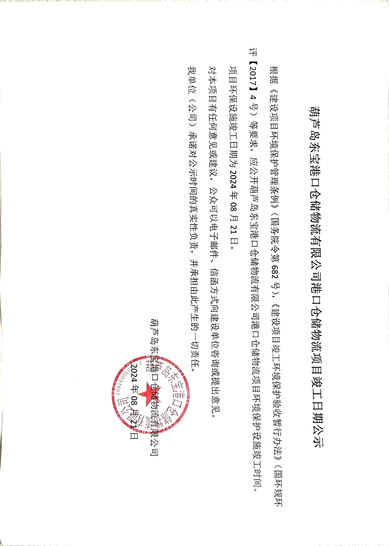 葫蘆島東寶港口倉(cāng)儲(chǔ)物流有限公司港口倉(cāng)儲(chǔ)物流項(xiàng)目竣工日期公示