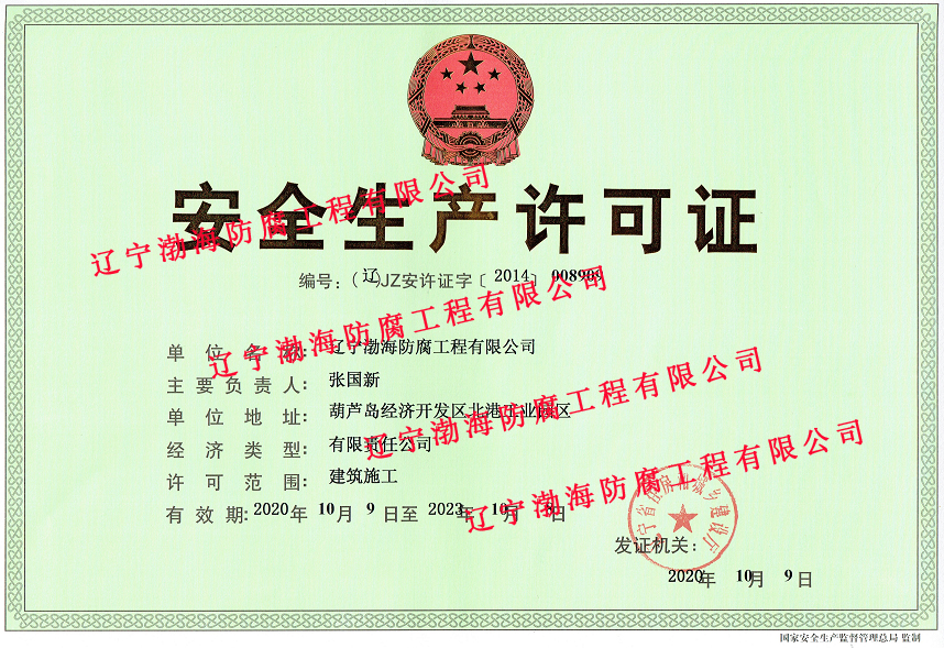 【渤海防腐】公司順利完成《安全生產(chǎn)許可證》延期換證工作